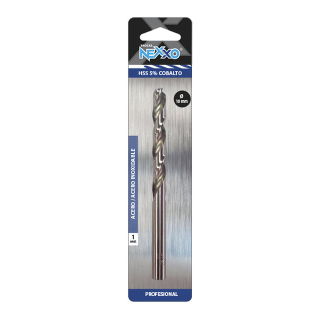 Broca metálica de 10 mm de diámetro, fabricada en acero. Adecuada para perforación en materiales metálicos de dureza media.