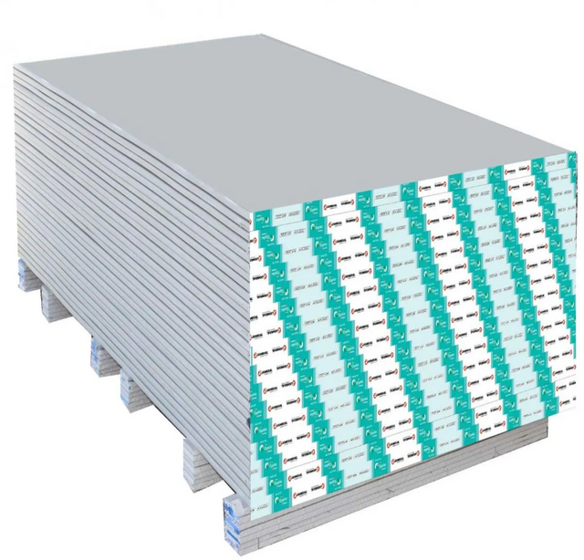 Placa de yeso tipo RH (resistente a la humedad) de Gyplac. Con espesor de 12,5 mm, formato de 120 cm x 240 cm y borde recto. Diseñada para resistir ambientes húmedos.