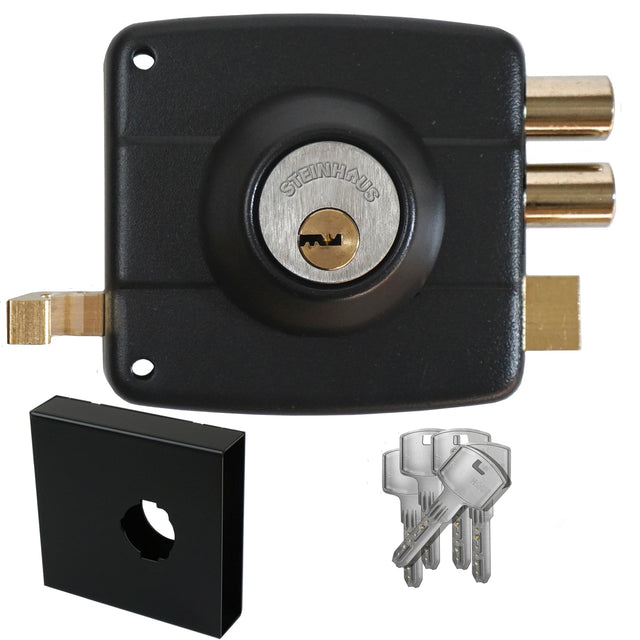 Cerradura Steinhaus con cilindro incorporado y 2 pitones, incluye 5 llaves. Proporciona comodidad y seguridad adicional al usuario.