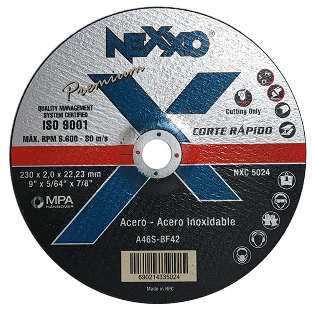 Disco de corte Nexxo Extra con diámetro de 9 pulgadas y espesor de 2,0 mm. Adecuado para cortes robustos.