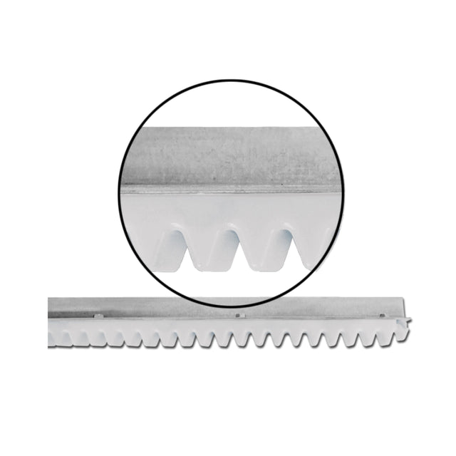 Cremallera reforzada de 1 m en acero galvanizado con inserto de nylon de alto desempeño, ideal para sistemas de portones corredizos automáticos.