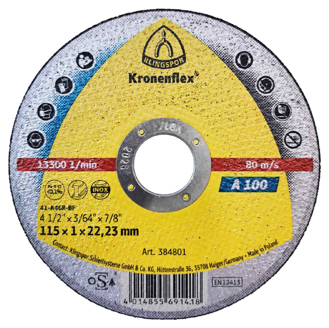 Disco de corte A100 con diámetro de 4 1/2 pulgadas, espesor de 1 mm y diámetro de agujero de 22 mm. Diseñado para cortes precisos.