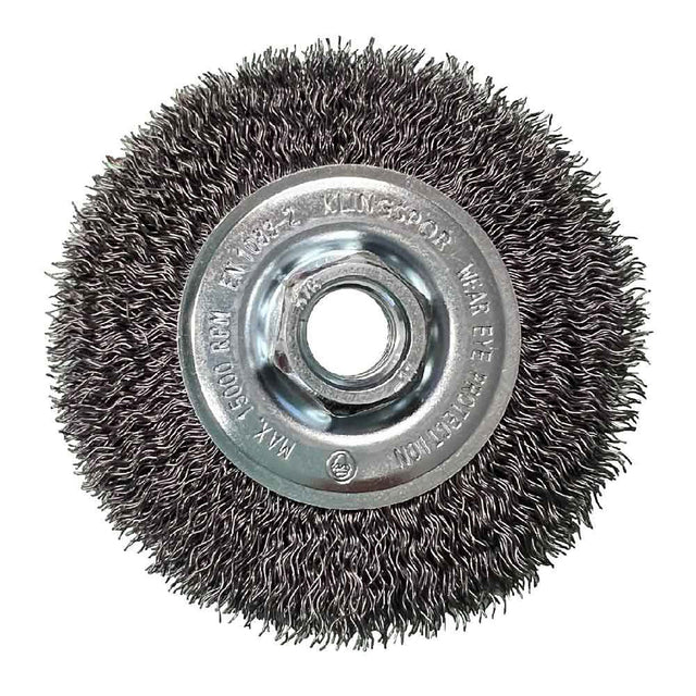 Grata plana de acero BR600W con superficie ondulada, diámetro de 115 mm y rosca M14. Ideal para limpieza, desbaste y acabado de superficies metálicas y madera, ofreciendo rendimiento uniforme y durabilidad.