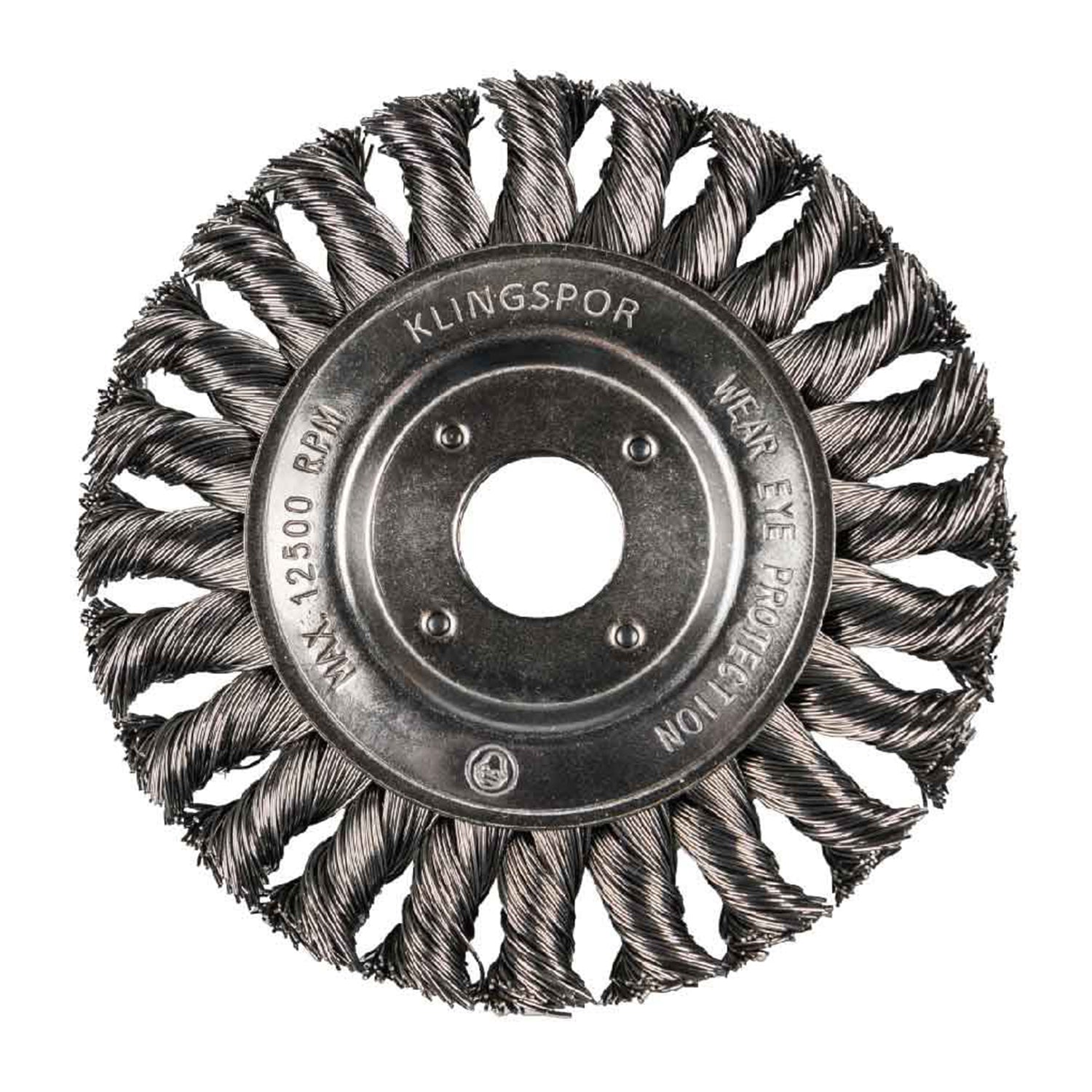 Grata plana de acero BR600Z con diseño trenzado, diámetro de 115 mm y rosca M14. Ideal para limpieza, desbaste o acabado de superficies metálicas y maderas, ofreciendo alta resistencia y durabilidad.